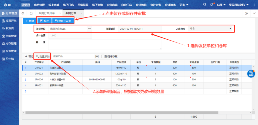 选择入库仓库、采购商品数量和品类,点击暂存或保存并审批。