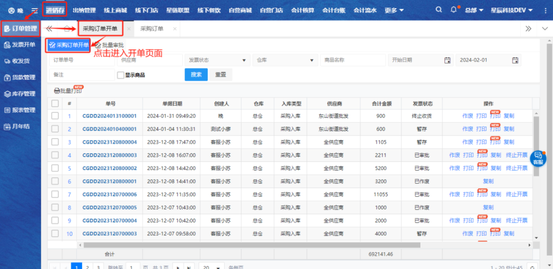 【进销存-订单管理-采购订单开单】,点击左上角“采购订单开单”,进入页面。