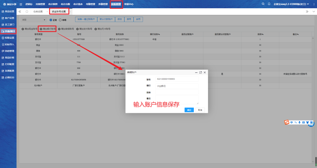 进入【系统管理-其他项目-资金账号设置】,点击增加对应类型的账号;勾选对应账号进行设置默认付款账户、修改或禁用等操作。