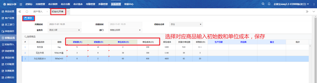 点击进入初始化开单页面,选择对应商品,输入初始数和单位成本保存并审批。