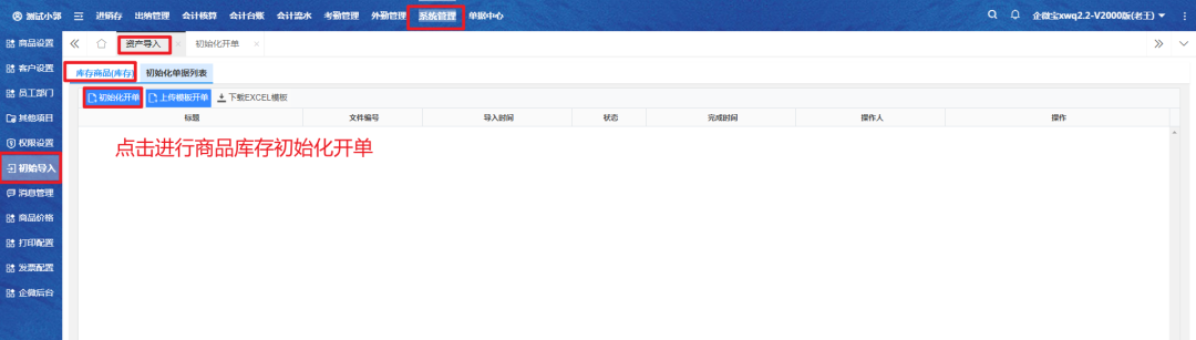 进入【系统管理-初始导入-资产导入】页面,对门店已有的库存进行初始化开单,支持批量上传模板开单。