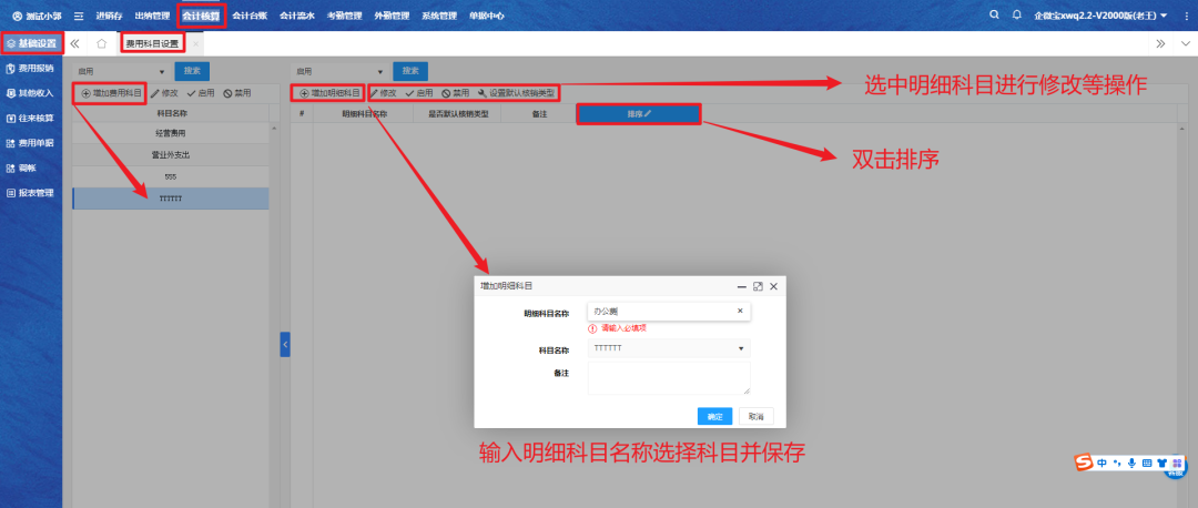 进入【会计核算-基础设置-费用科目设置】,点击增加费用科目,在对应费用科目下增加明细科目,进行排序。