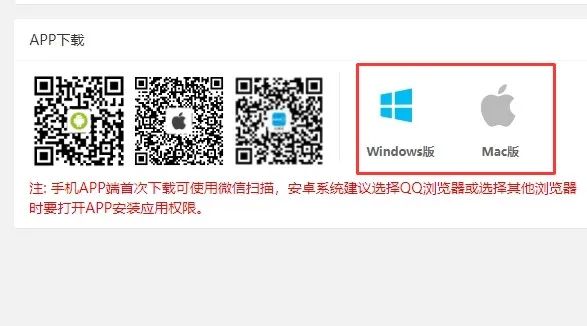 ①手机APP端首次下载可使用微信扫描,安卓系统建议选择QQ浏览器或选择其他浏览器时要打开APP安装应用权限。