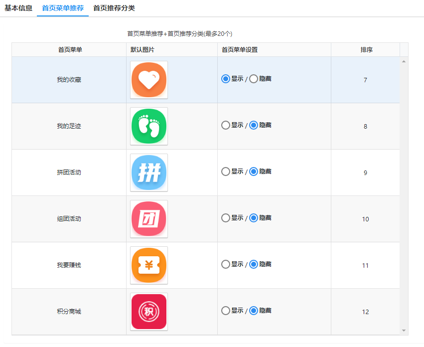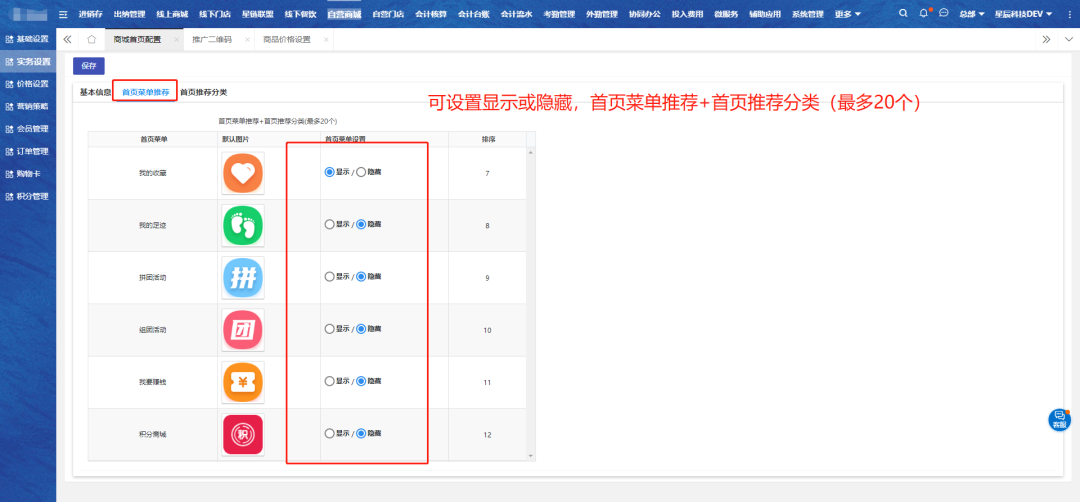 二、设置首页菜单推荐,上传相关图片,可选择显示或隐藏,可自定义顺序,点击保存。