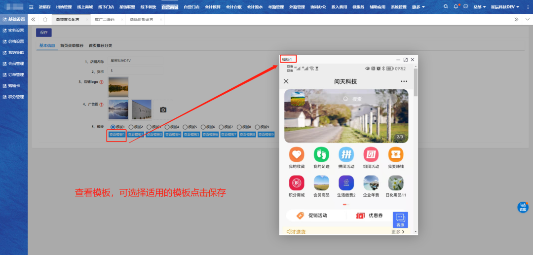 为方便商家设置,企微宝还提供了多种页面模板可供选择,点击查看模板即可在线预览,选中模板,一键保存即可在前端立即生效。