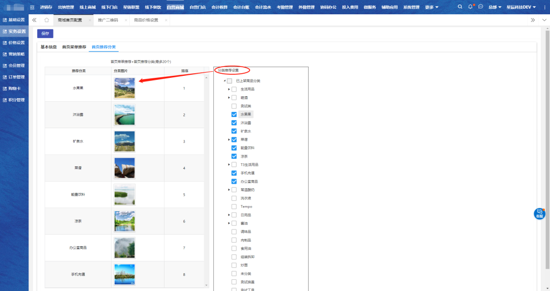三、首页推荐分类,勾选右边的分类菜单,即可添加显示在左边,可上传分类图片,设置完成后点击保存。