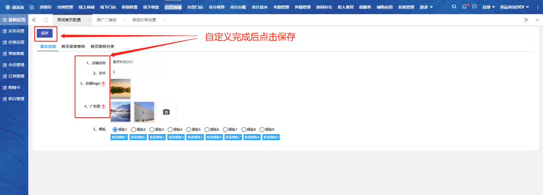 一、设置输入店铺名称、上传店铺logo、广告图,点击保存。
