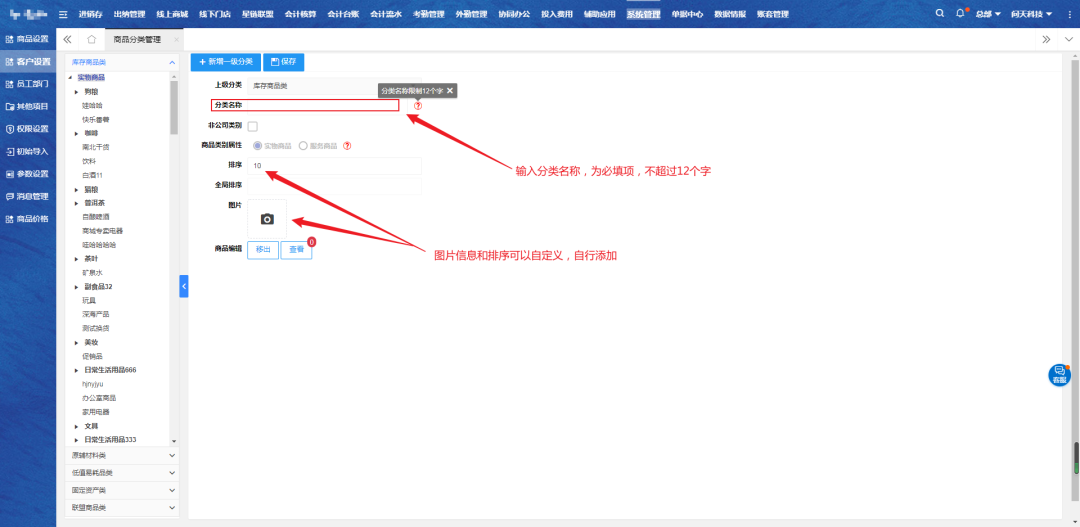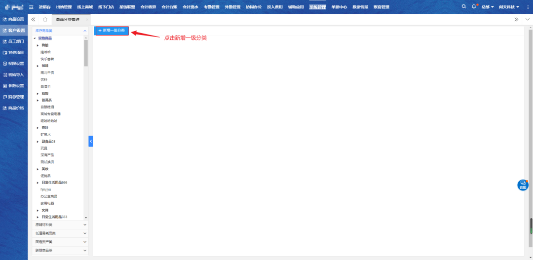 一、选中【库存商品类】,点击【新增一级分类】
