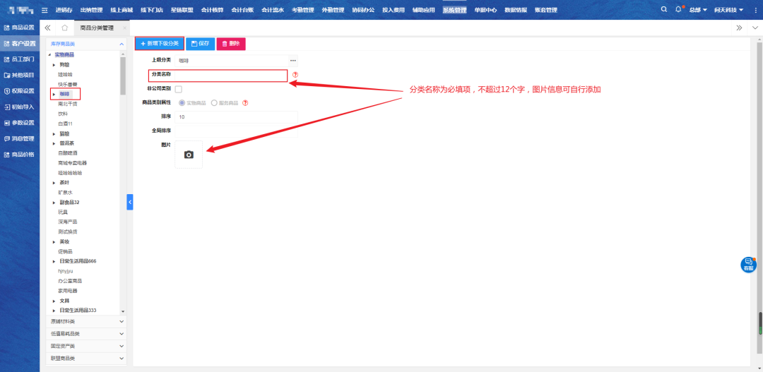二、选中一级分类,点击【新增下级分类】按钮,输入分类名称、排序、图片等信息,然后点击保存。