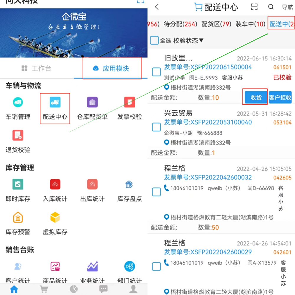 三、设置完成后,司机打开手机端进入【配送中心】模块,选择配送中,点击收货
