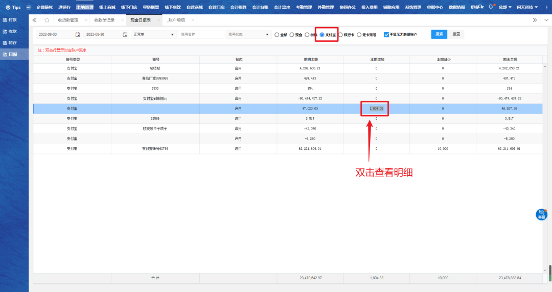 三、进入现金日报表,选择对应账户,双击查看明细