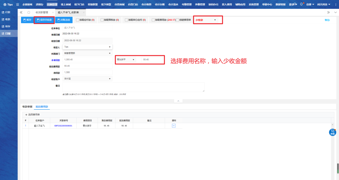 选择少收款,输入金额、账户、选择费用名称等,保存并收款。