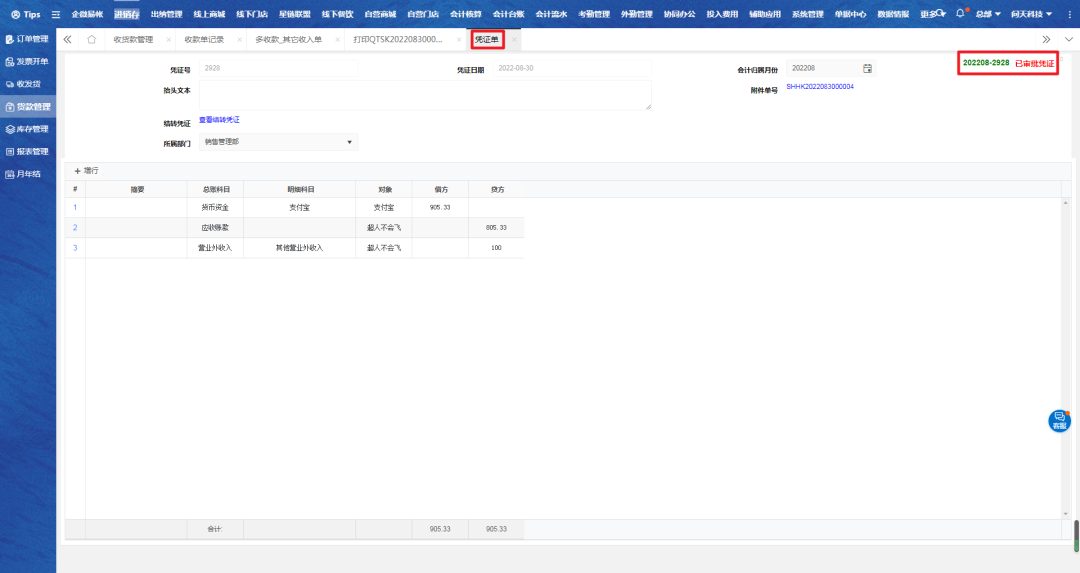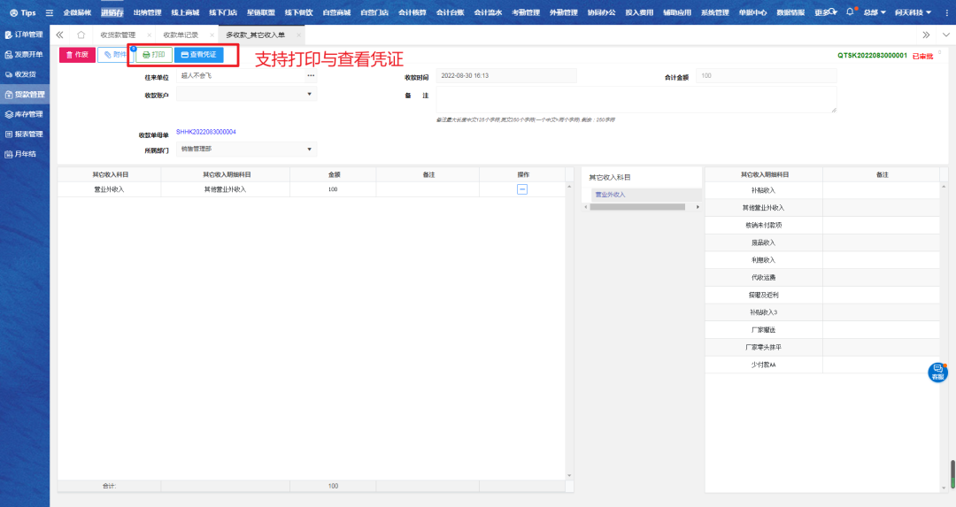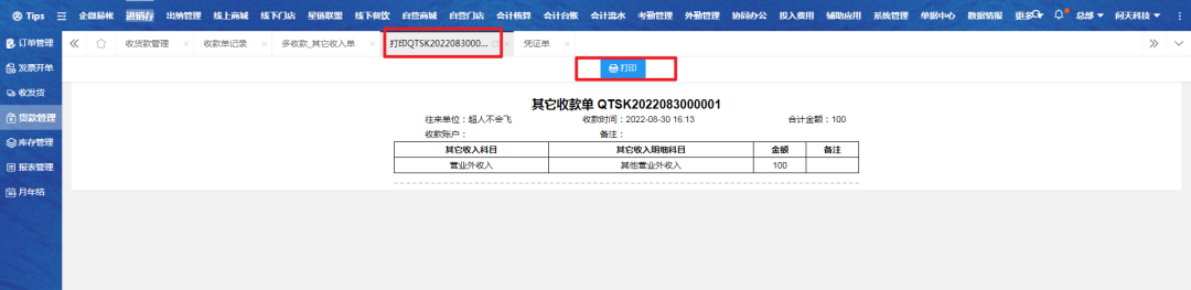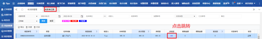 选择对应单据,点击多收款金额跳转其他收入单;