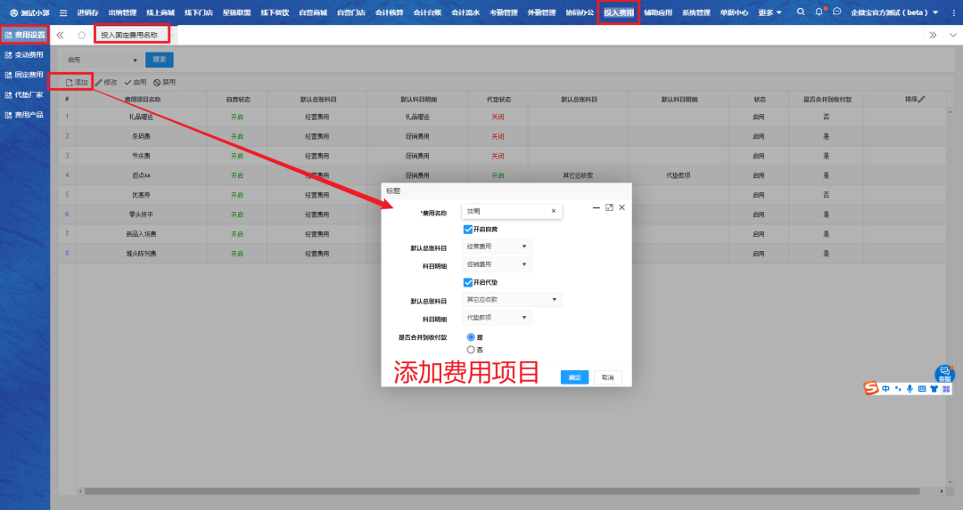 一、进入【投入费用】-【费用设置】-【投入固定费用名称】,点击添加费用项目,输入名称保存。