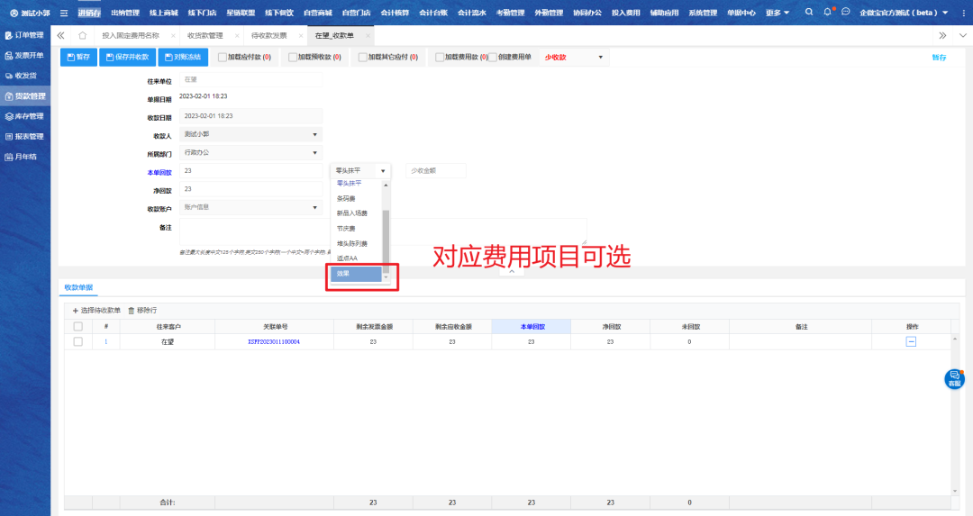 运用多收款功能,则在【其它收入核算】会对应生成一单其它收款单;收款单运用少收款功能,则在【自营固定费用】会对应生成一单抵扣的固定费用单。