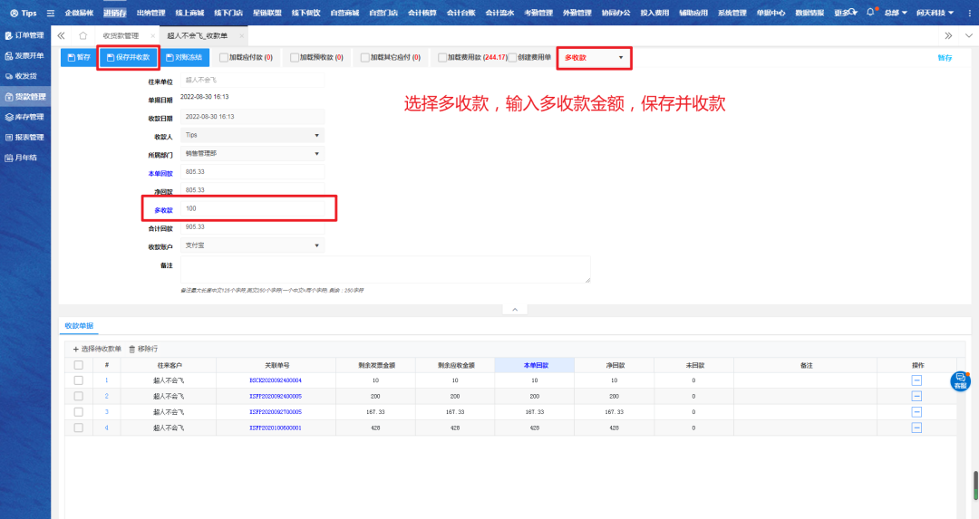 选择多收款,输入金额、账户等,保存并收款。