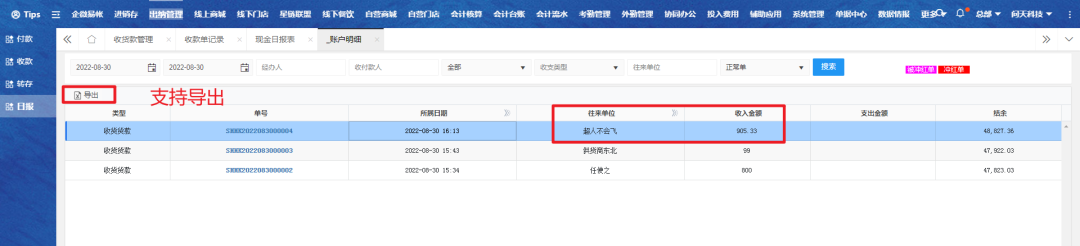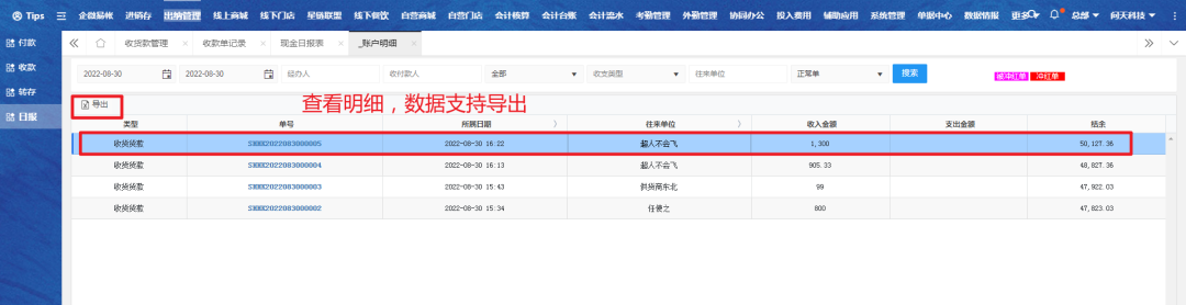 选择对应账户明细进行查看,数据支持导出。