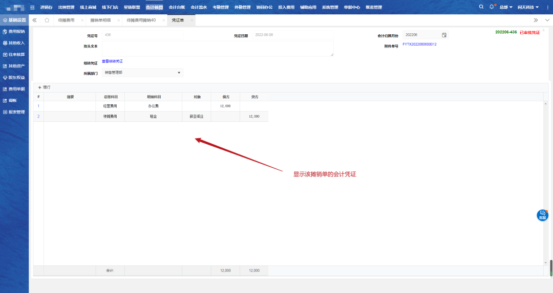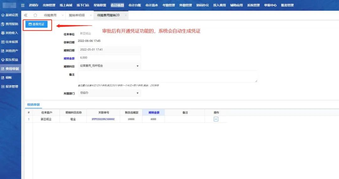 打开对应摊销单,点击“查看凭证”后,显示该摊销单的会计凭证。