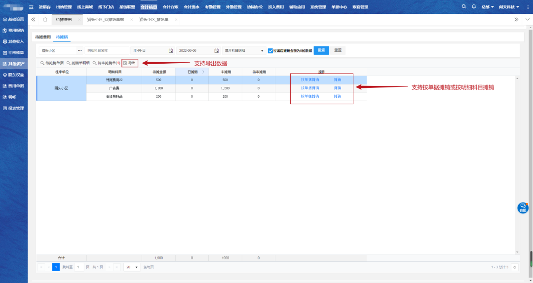 确认无误后保存并审批,单据跳转至待摊销页面可导出,点击单据详情支持打印,可按单据摊销或按明细科目摊销。
