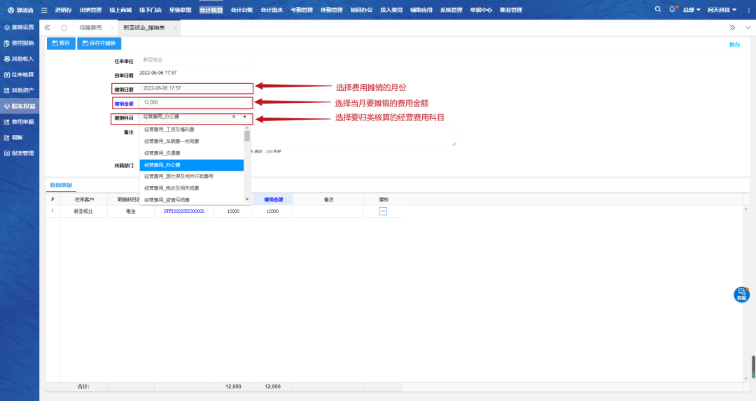 三、摊销单详情页面,会计人员可根据企业实际情况选择摊销至任意科目,确认无误后点击保存摊销审批完成。