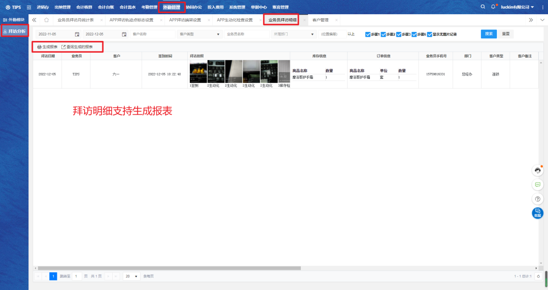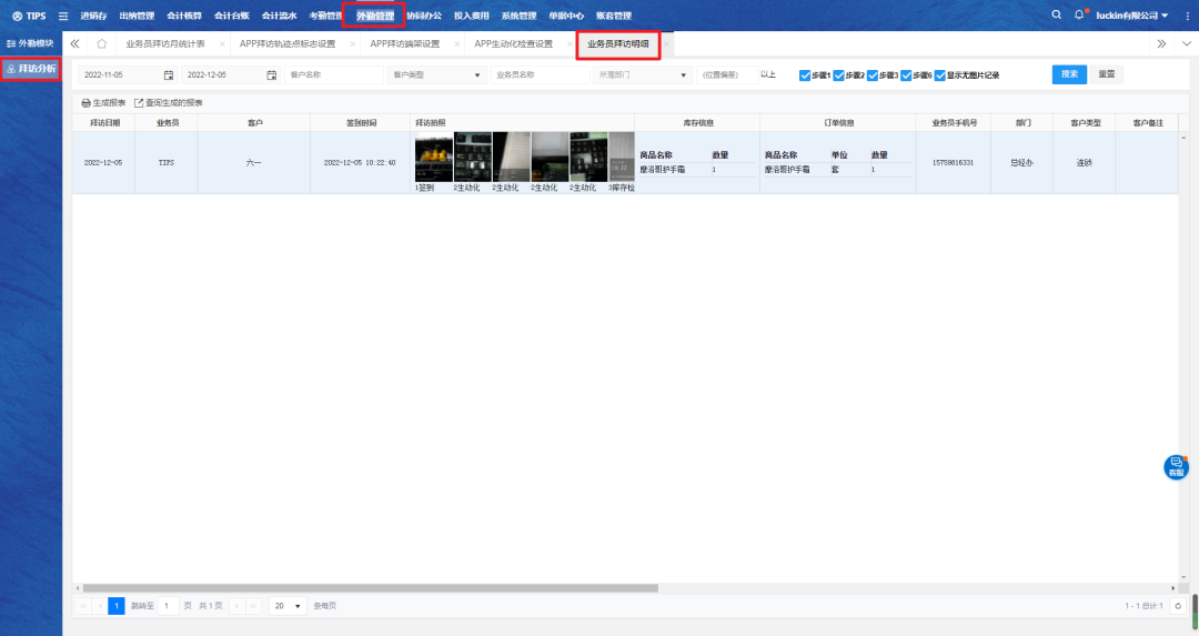 电脑端:【外勤管理】-【拜访分析】-【业务员拜访明细】