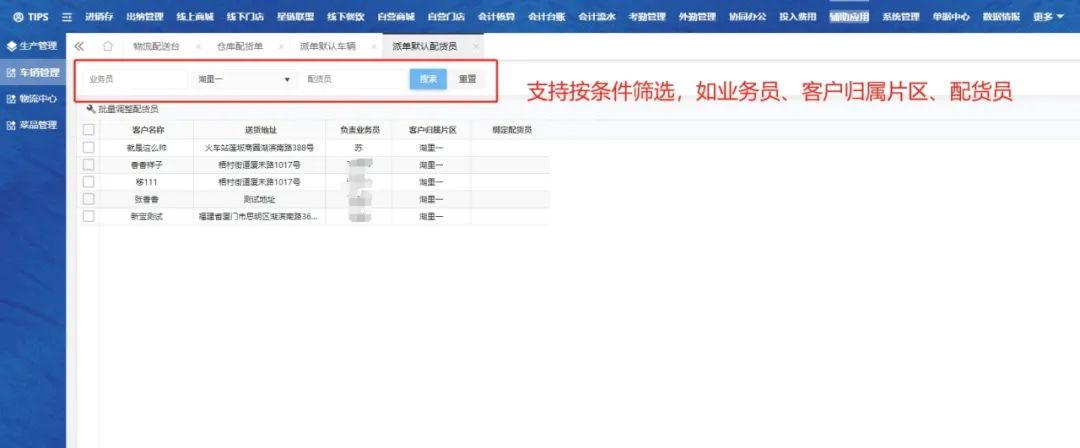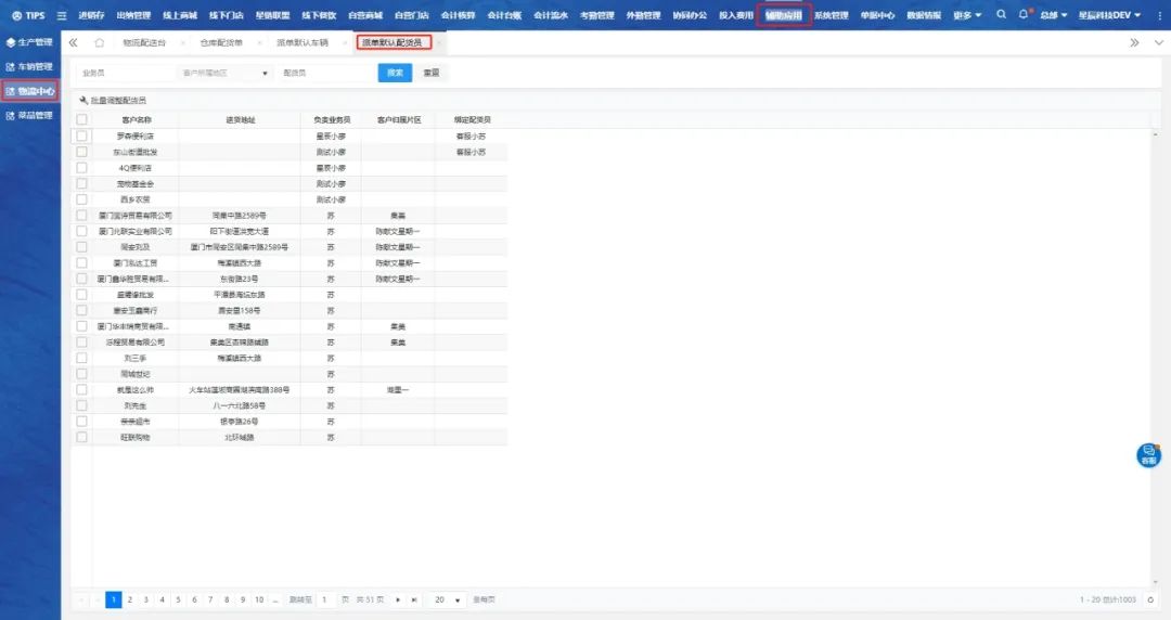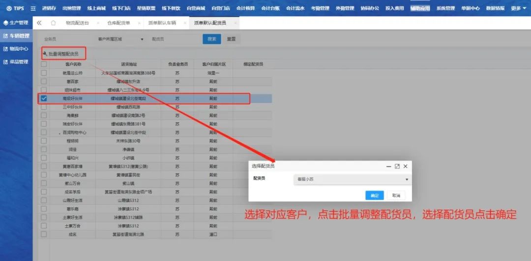 勾选对应客户,点击批量调整配货员,选择对应配货员,点击确定。(支持多选批量调整配货员)