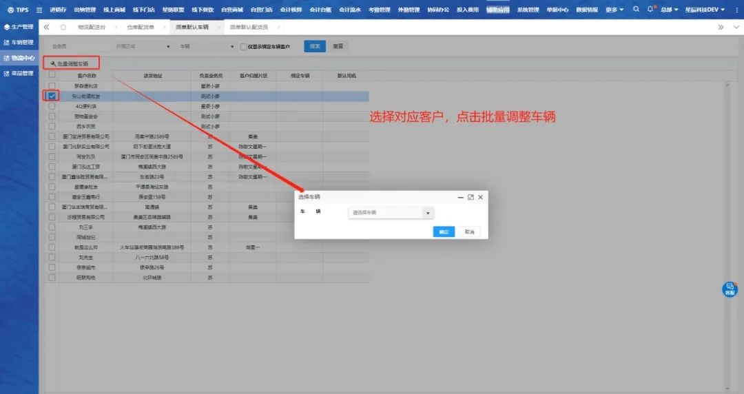 二、调整派单车辆同样,选中对应客户,点击批量调整车辆。