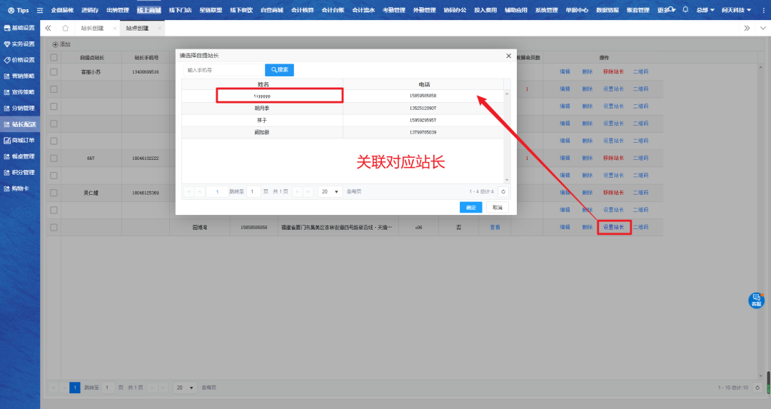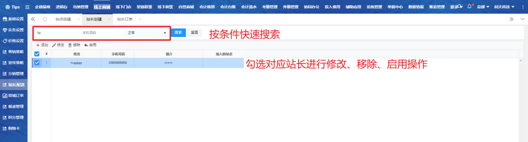 在条件栏可输入关键字快速查找对应站长,进行修改、移除等操作。