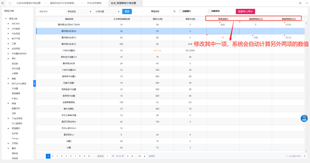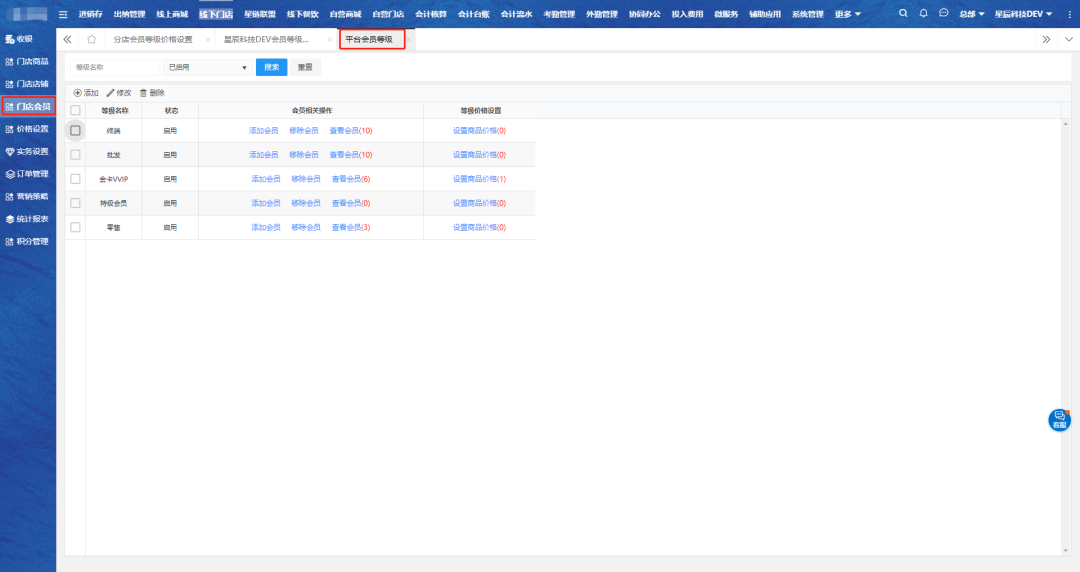 进入分店会员等级价格页面,可查看该分店当前执行的会员等级及价格配置,