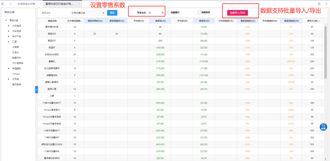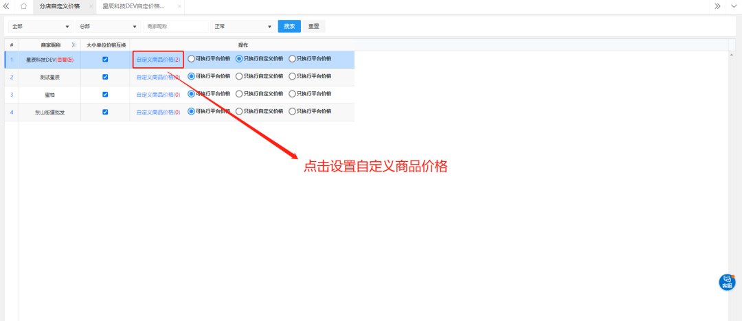 也可自定义商品价格,点击对应商品设置商家采购价、核算价、平台划线价等等;