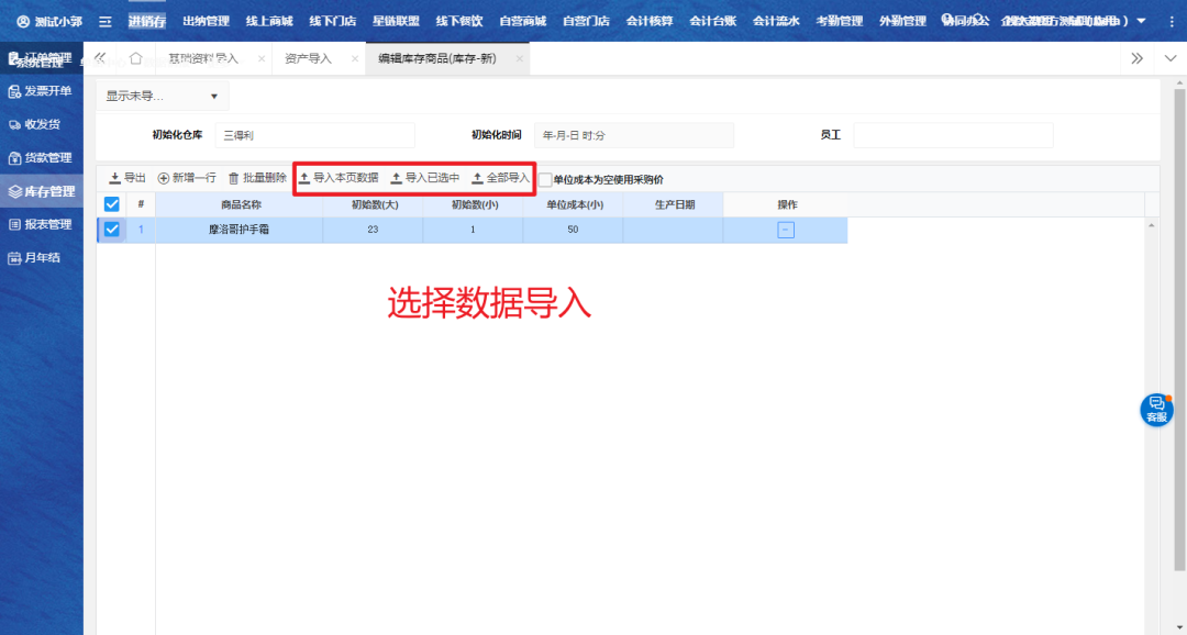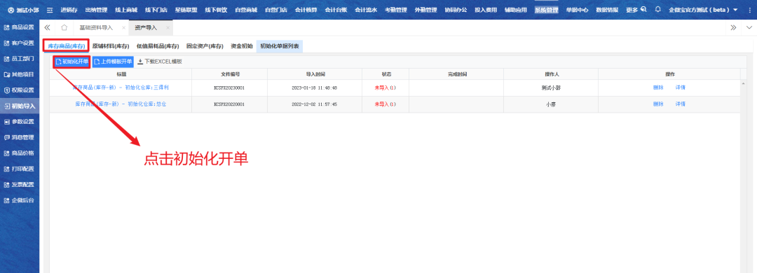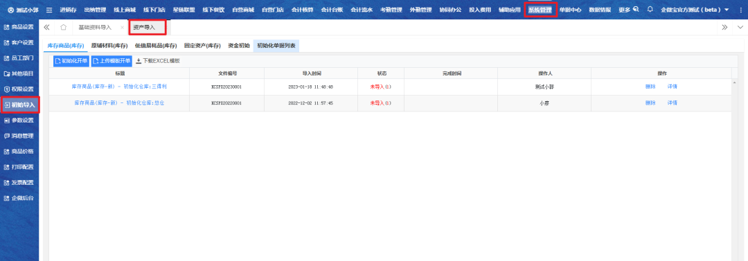 在使用系统之前,需要对门店已有的资产库存进行系统的初始化,企微宝的初始导入模块中,设置了资产导入的功能,如商品、固定资产等等,使用该功能快捷的录入商品库存和对应的成本,保存及完成库存以及成本的初始化。