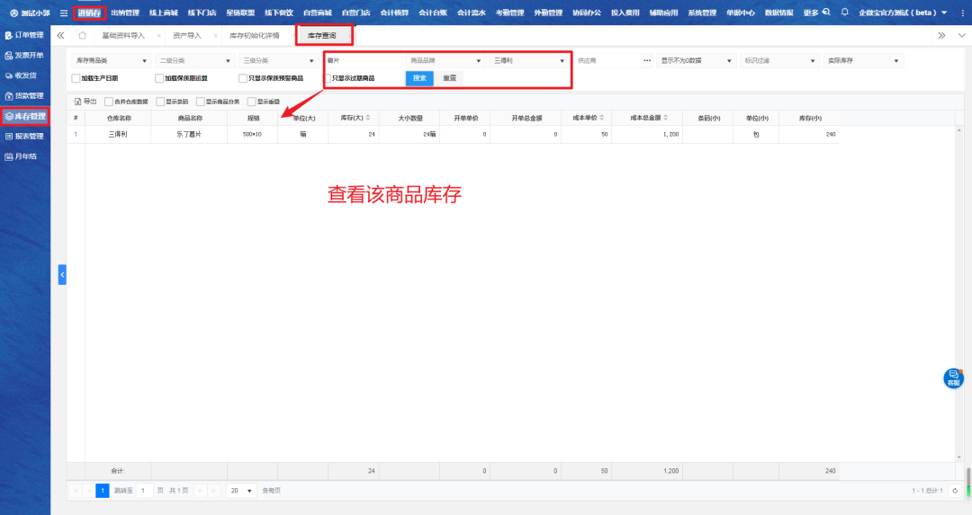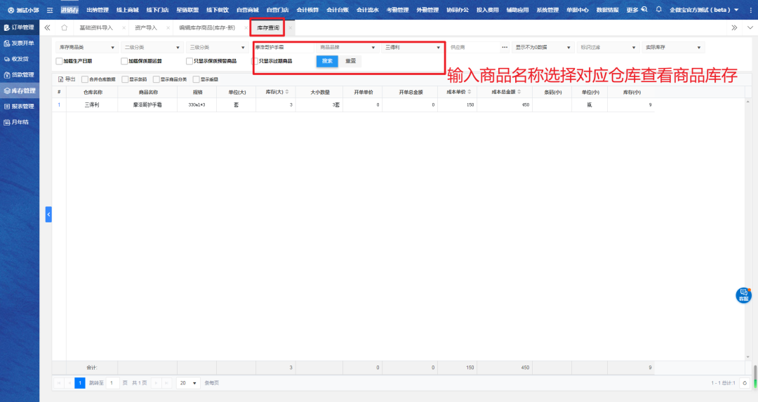 二、进入库存查询页面,输入商品名称选择对应仓库查看库存。