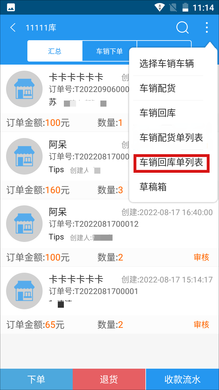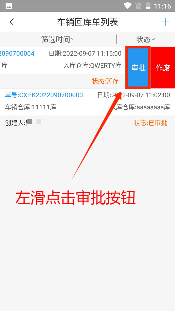 二、展开右上角选择车销回库单列表,选择对应回库单左滑审批。
