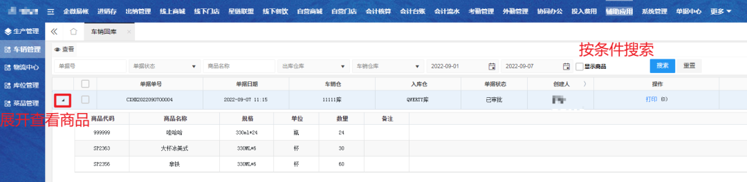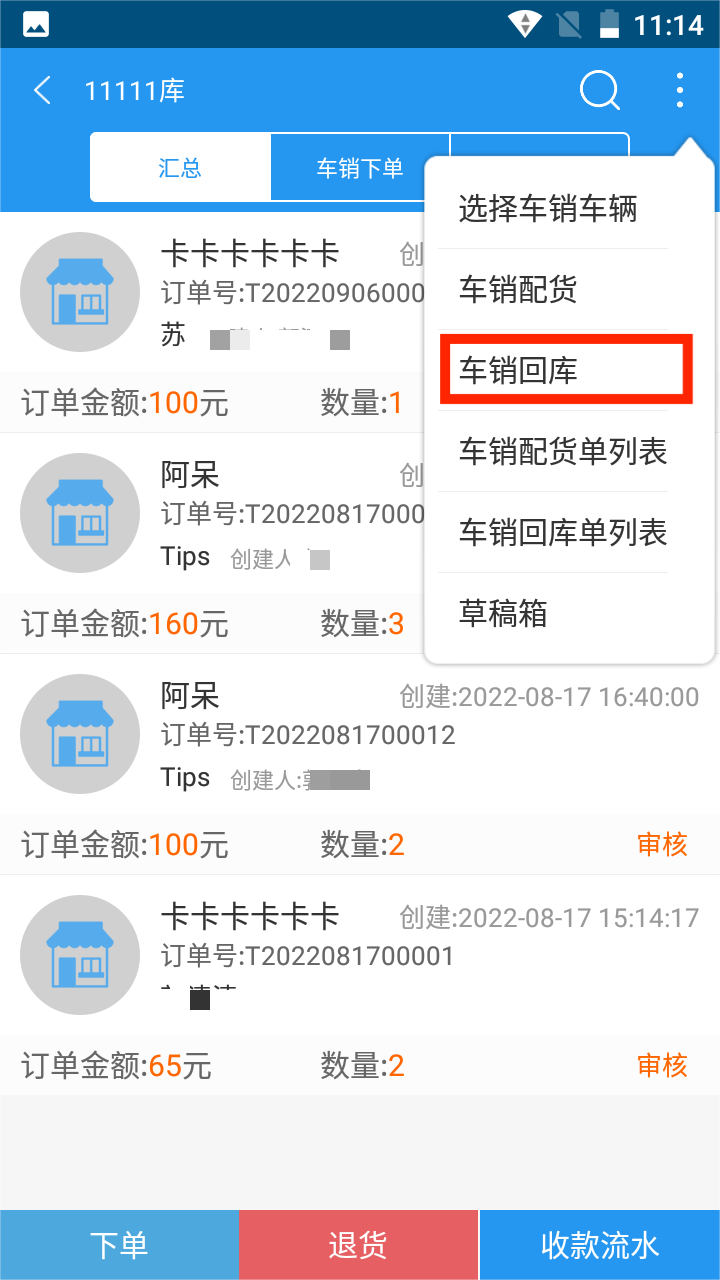 一、进入车销回库页面,选择对应车销仓进行回库操作;