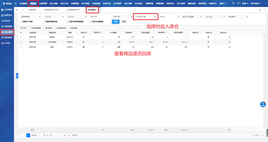 二、进入库存查询页面,选择对应仓库,查看商品是否回库。