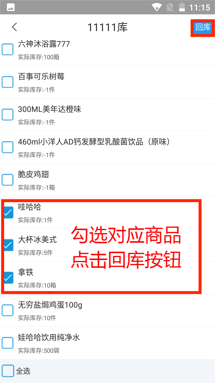 勾选对应商品点击回库,选择对应仓库提交入库;