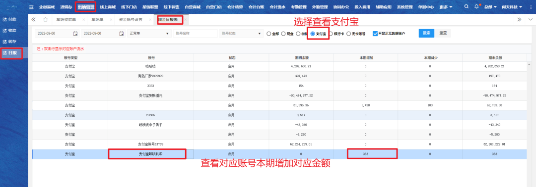 一、进入现金日报表页面,选择查看对应账号是否入账;