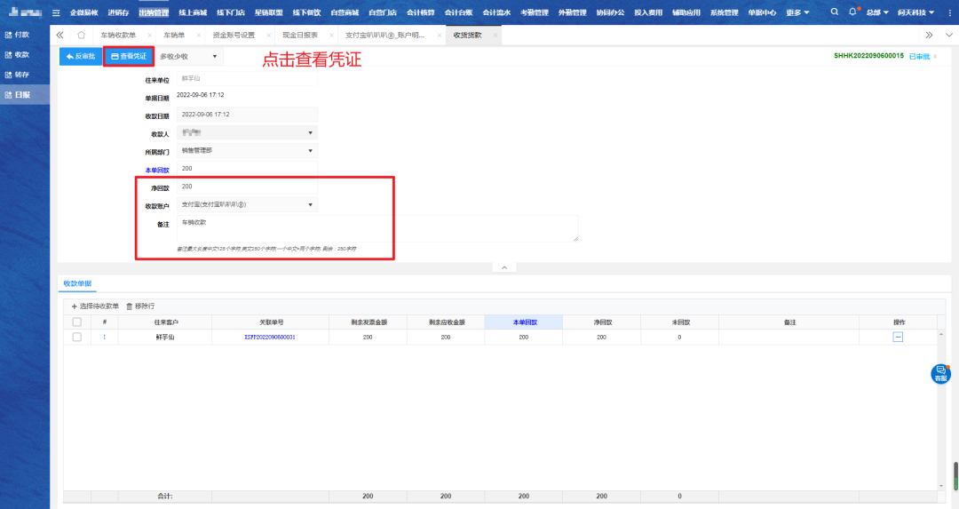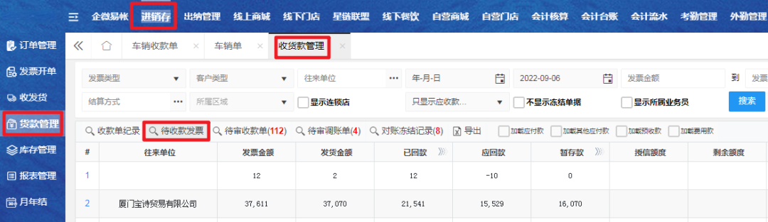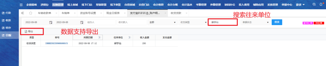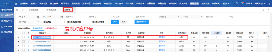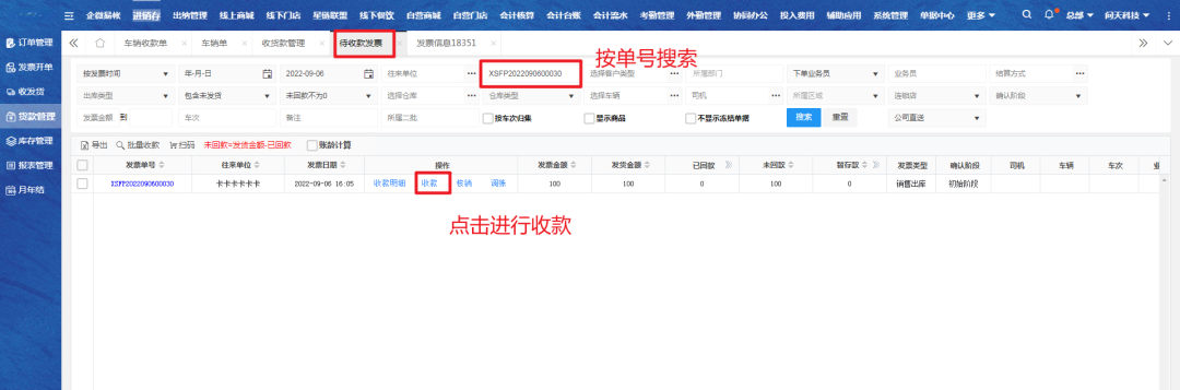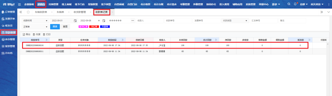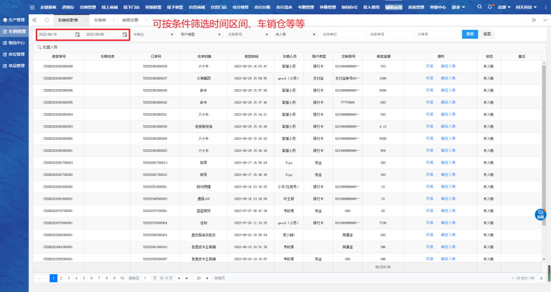 二、进入车销收款单页面,可筛选时间区间、车销仓等条件快速查找对应车销单;