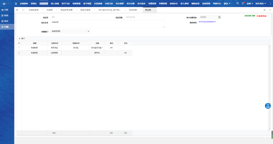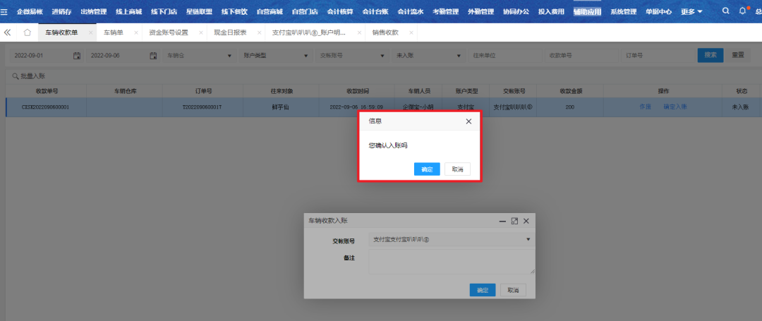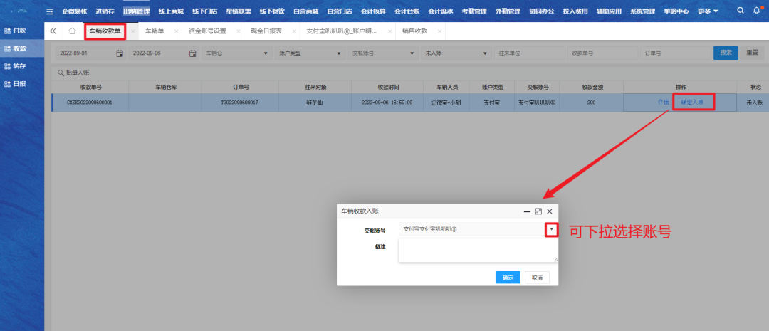 三、选择对应车销单点击确定入账,下拉选择对应账号;