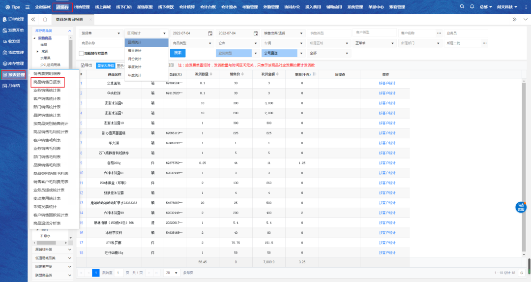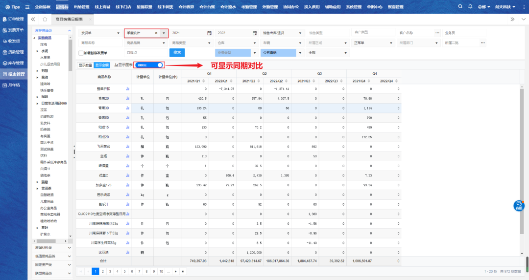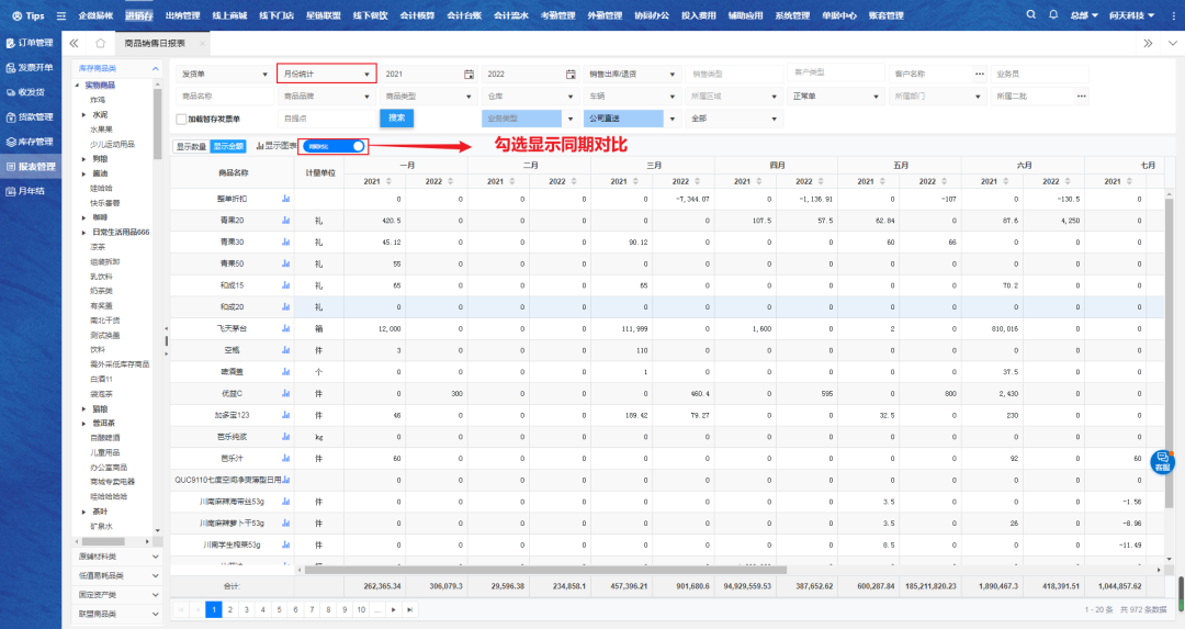 企微宝的进销存模块中,通过商品这个维度生成的商品销售日报表,可根据每日、月度、季度、年度进行统计,查看同比发展速度。