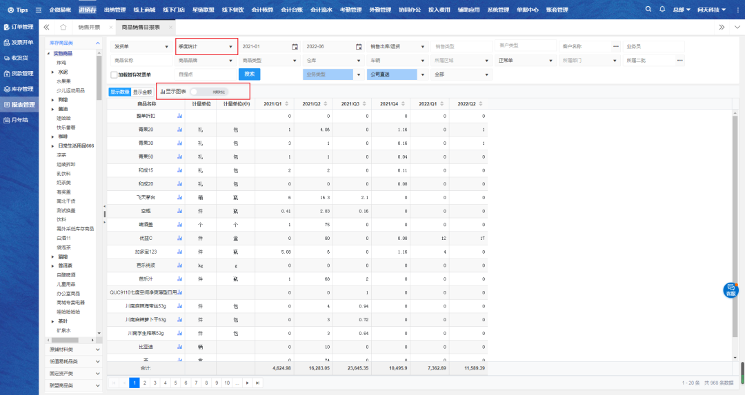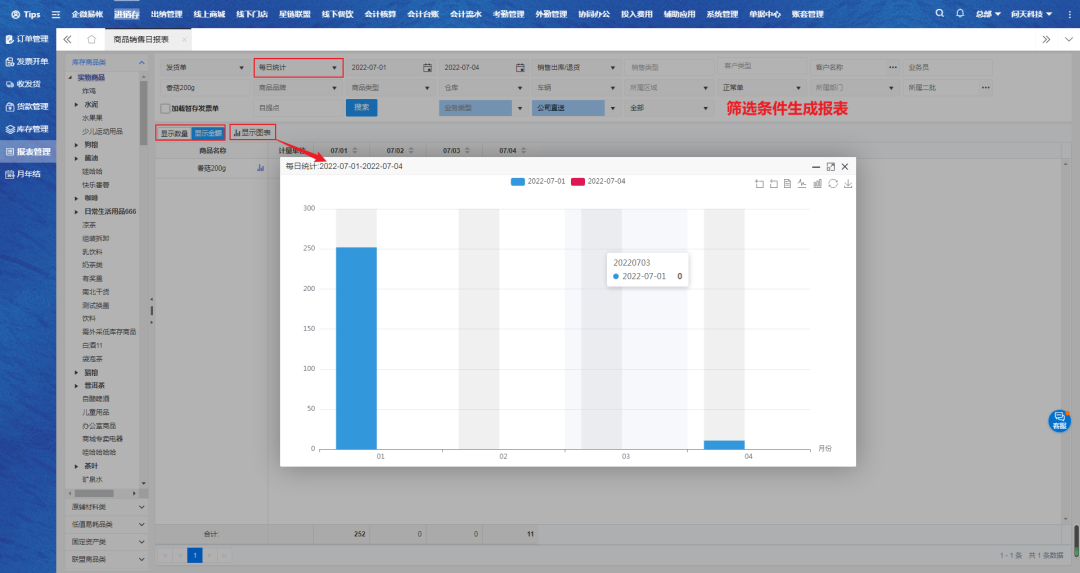 可筛选单一商品或客户等其他条件生成报表,有表格和图表两种呈现方式;