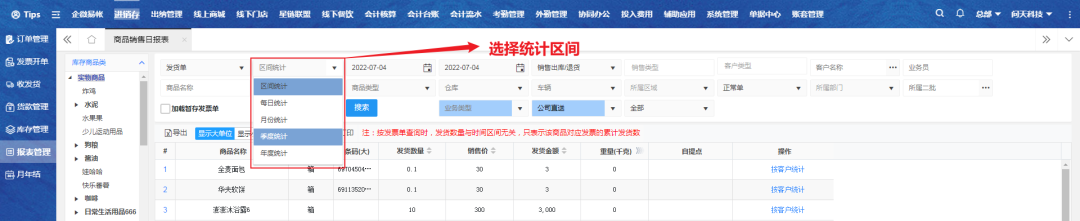 一、进入报表页面,可选择统计区间、每日、月度、季度、年度;